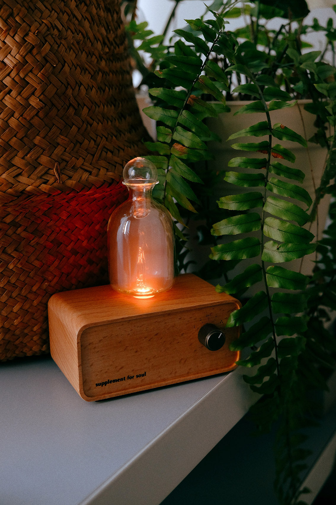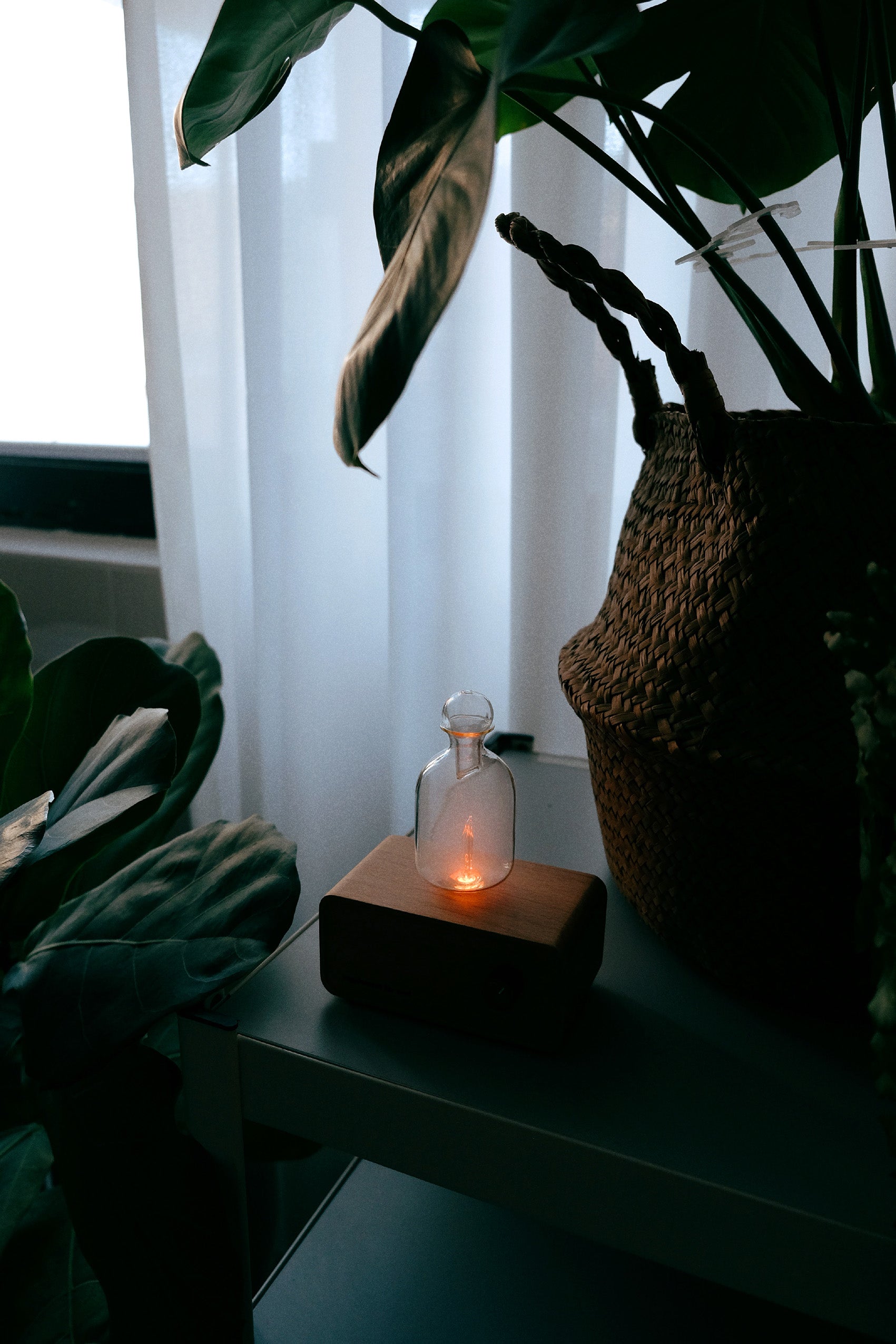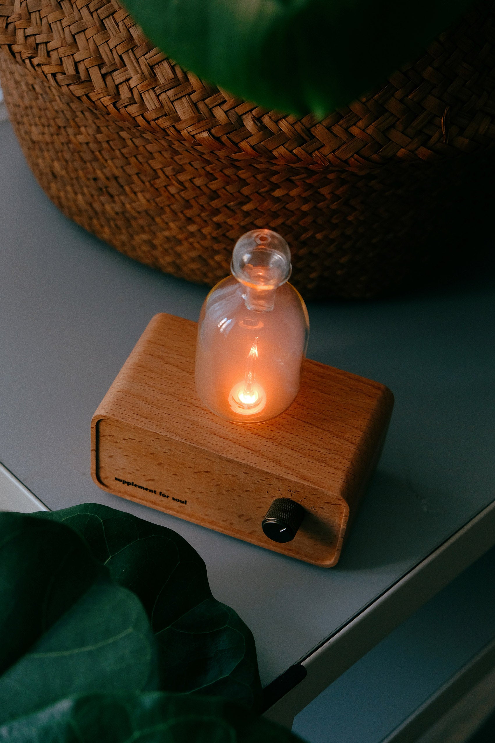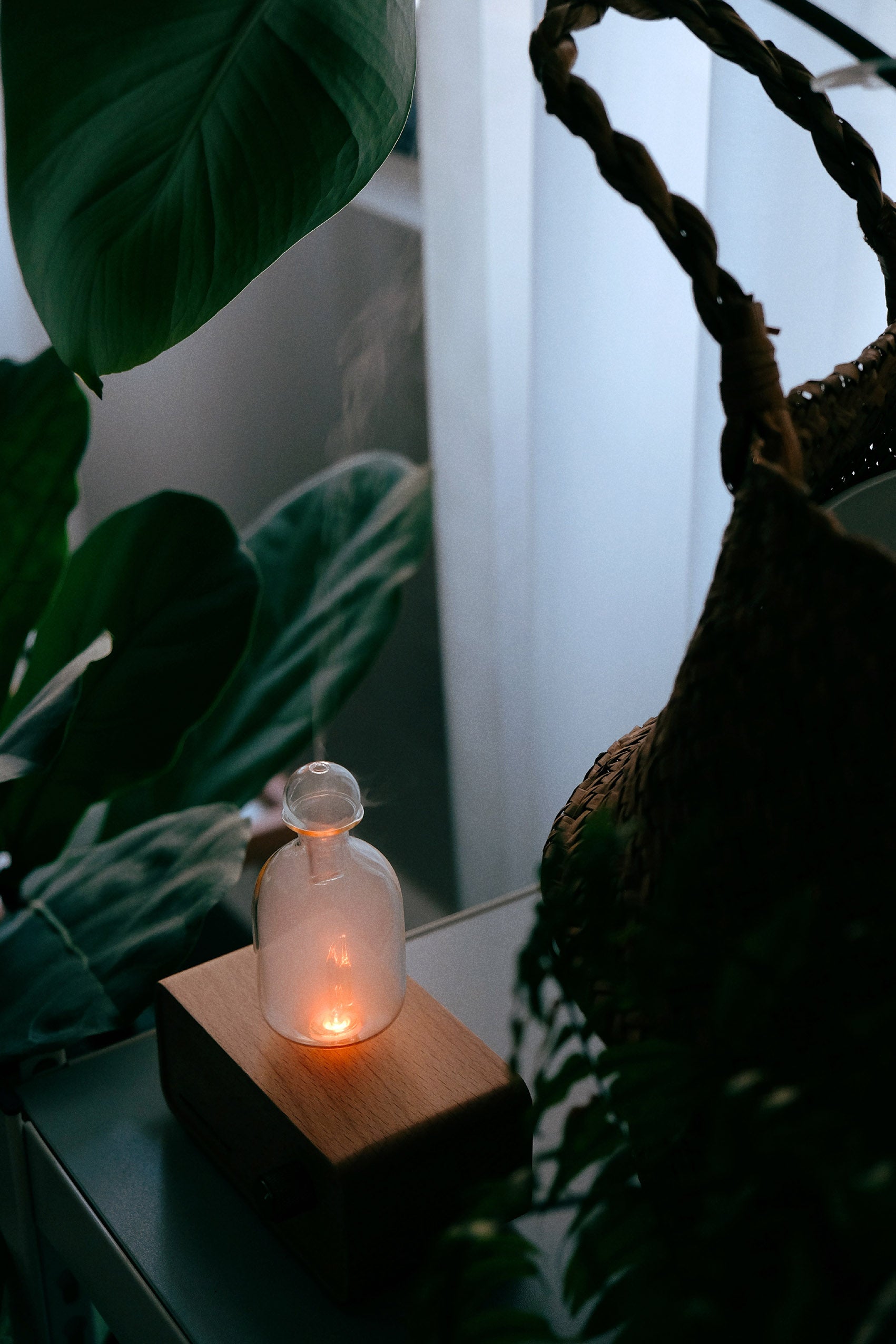 1/將玻璃霧化瓶垂直旋轉插入木底座圓形矽膠圈內,確保緊密裝好。