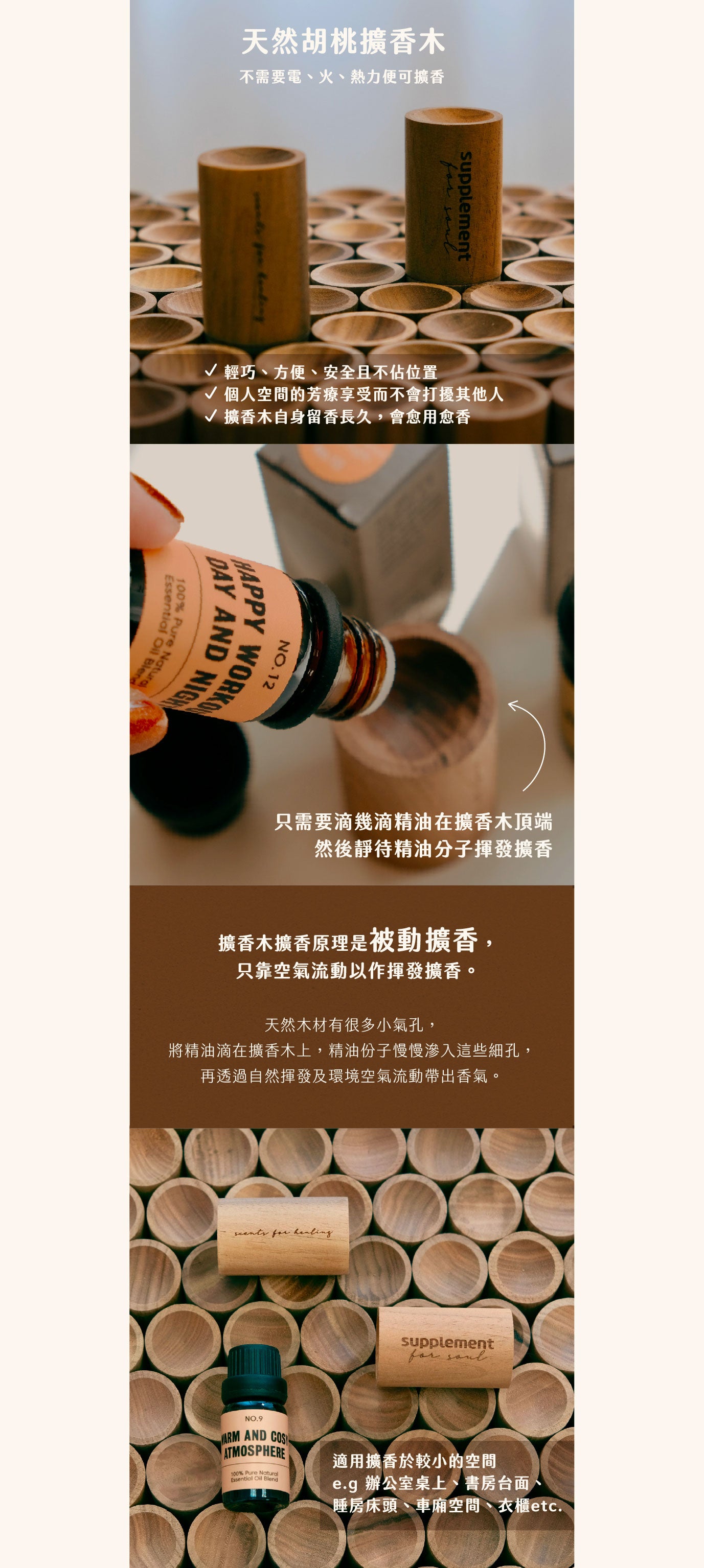擴香木原理係被動擴香,滴精油喺上面之後,精油先滲入木入面,過一陣間之後會慢慢揮發返出嚟,擴散到空間入面可以香到起碼幾小時 - 大半日( 都要視乎你滴幾多滴精油、環境因素影響)但就要係小空間,例如台面,床頭,車廂etc.